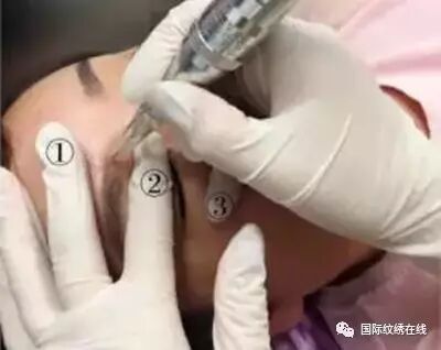 2、两指适当用力将眉部皮肤绷紧,合适力度判断:将皮肤纹路撑开即可,不可将皮肤绷到发亮(那太紧了!)