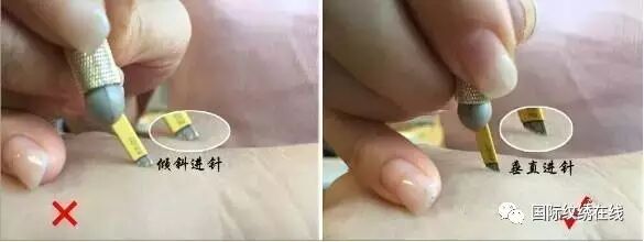 初学者其实都明白这个道理,但是具体的操作中,由于紧张等因素,划着划着就会不知觉将针倾斜了!这个时候,我们要将划针的速度放慢,注意力的重点始终集中在进针的角度上,仔细观察,不要分心!如下图所示: