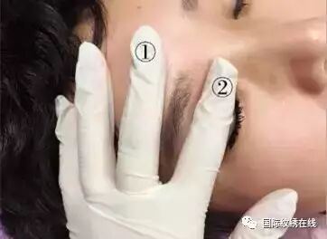 1、如下图所示,左手的食指②与中指①呈剪刀手状置于眉毛部位上;