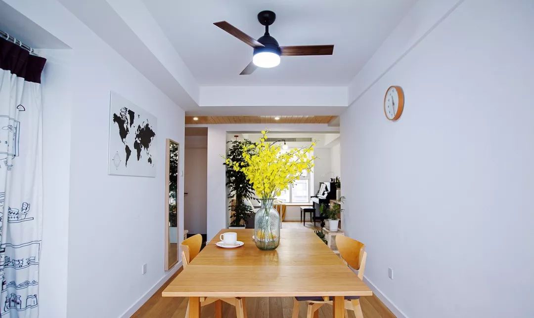 ▲ 简洁的餐桌椅,个性的吊扇灯,木质挂钟,桌上的跳舞兰尽情绽放着。