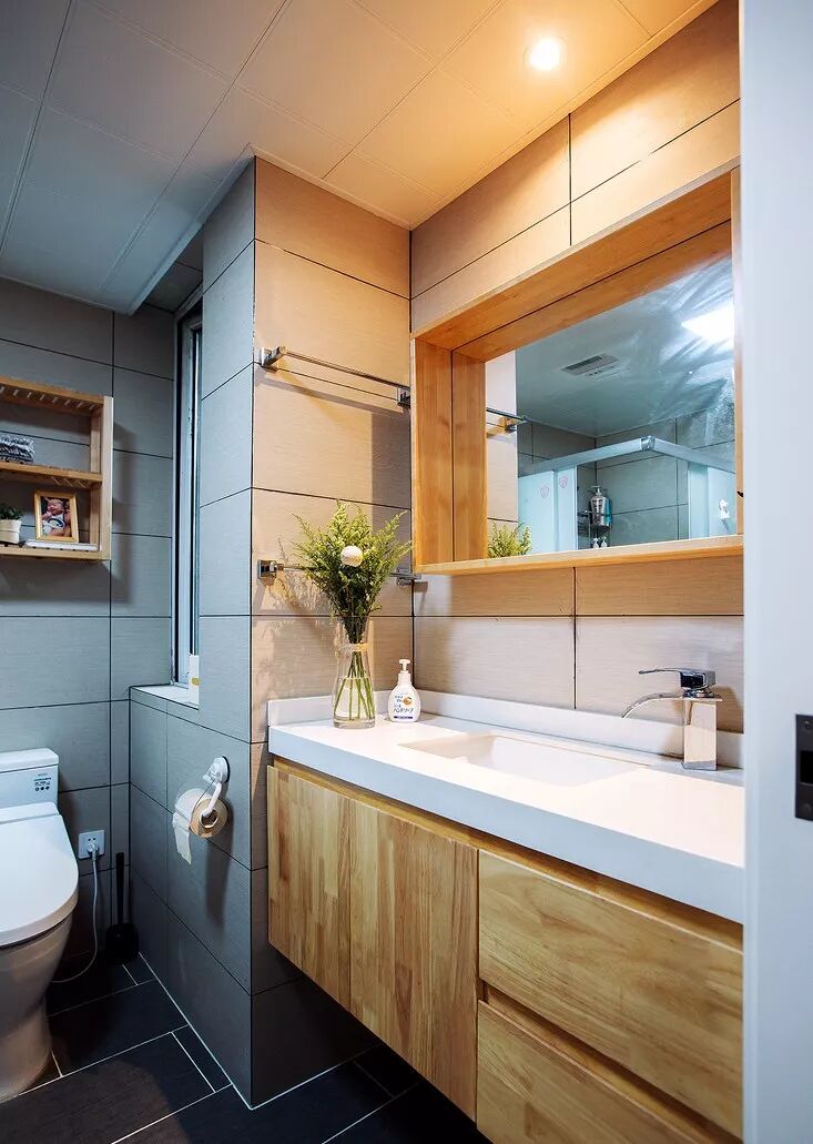 ▲ 卫生间原木色的台盆柜,缓和了灰色墙地砖带来的冰冷感。