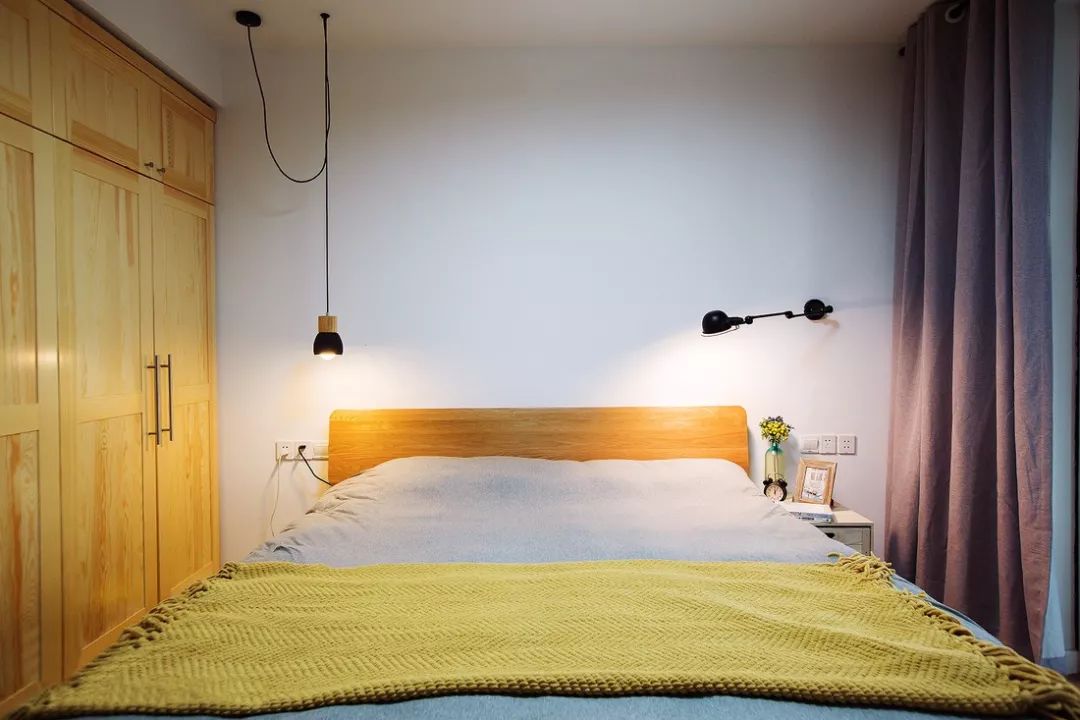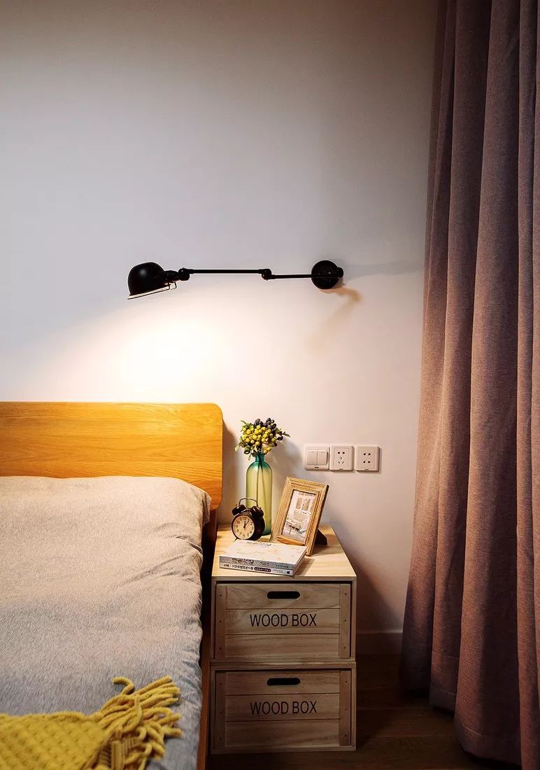 ▲ 卧室没有过多的装饰,一边木质小吊灯、一边伸缩壁灯,躺在床上各有一片空间来做自己想做的事。