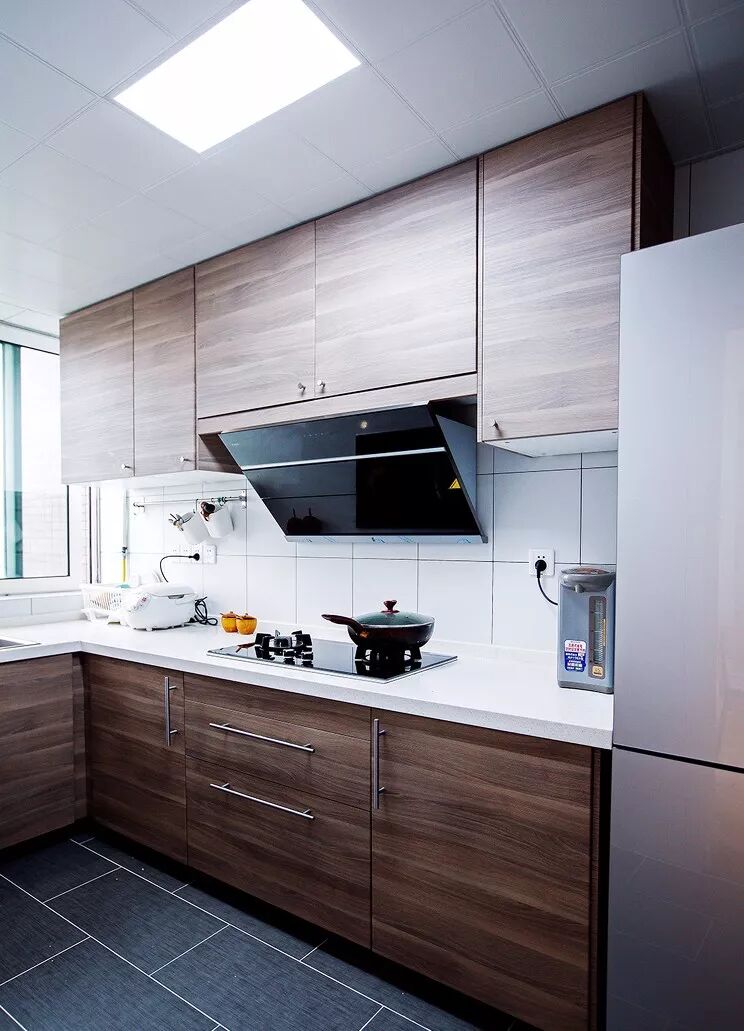 ▲ 厨房,黑胡桃木色的橱柜,深灰色地砖搭配白色墙砖,整个厨房显得干净整洁。