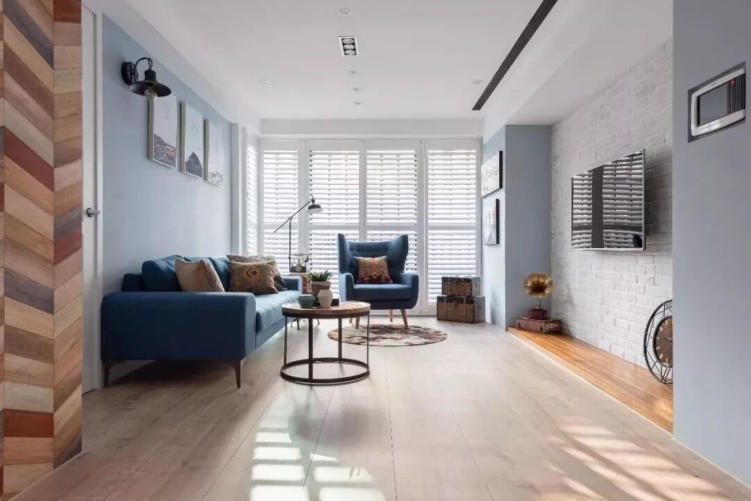 淡蓝色的沙发背景墙,深蓝色的布艺沙发和单人沙发显得整体很优雅精致。