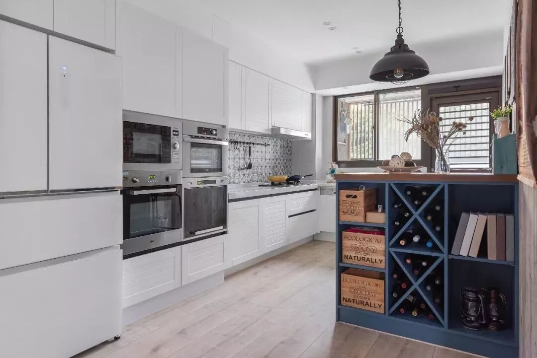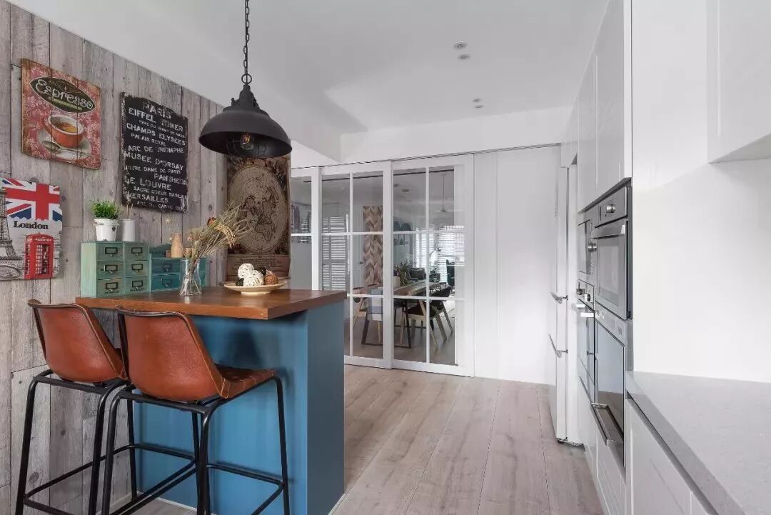 厨房里面有一个小吧台,隔着白色的玻璃推拉门,可以看到对面的餐厅和客厅,小吧台的背景墙也是很有特色的,木纹砖墙,摆放一些很有年代感的装饰画,墙面上设计了做旧的小木柜子。