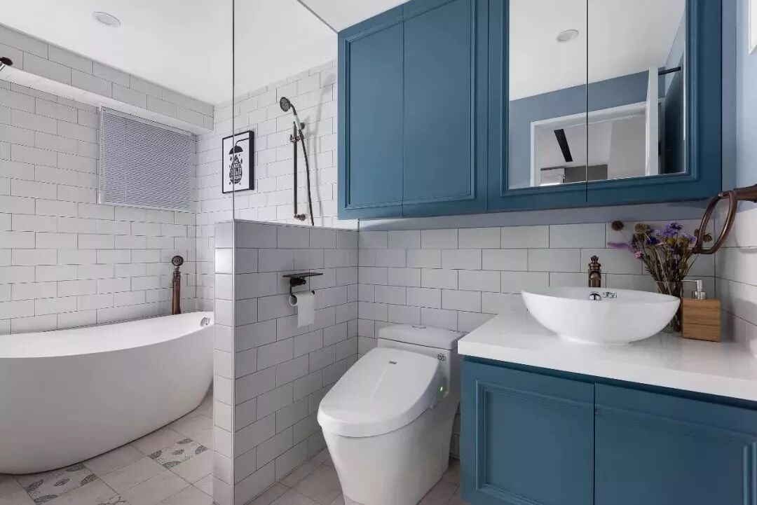 一面铺满白色小方砖的半矮墙和透明的玻璃门将干湿区域做了分隔,浴缸、淋浴、马桶、洗手台,都有各自的地方,蓝色的浴室柜和洗手台下面的蓝色收纳柜,看上去都很有质感。