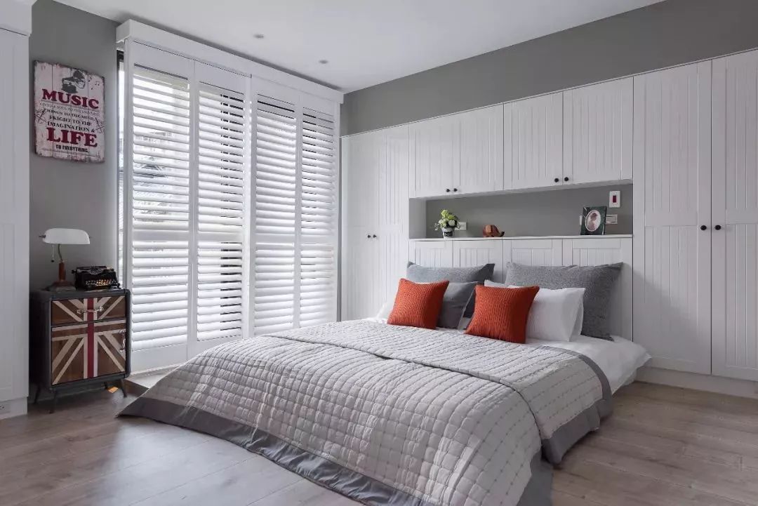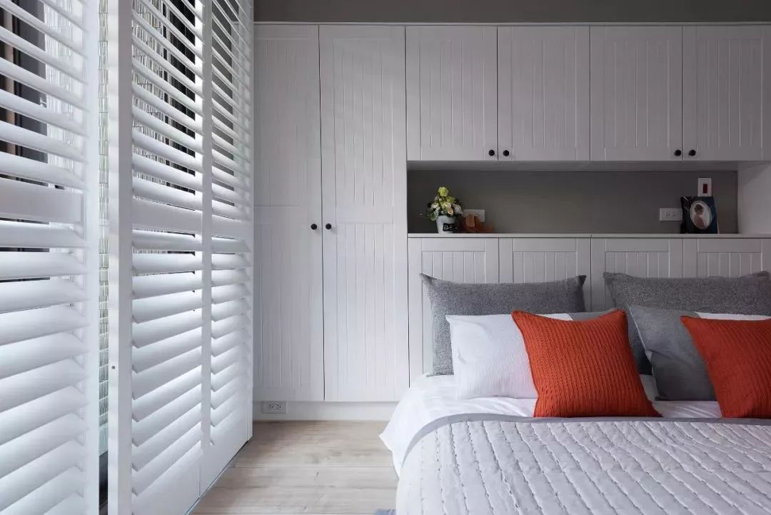 整面床头背景墙都设计成收纳柜了,中间部分留空,是为了摆放一些温馨的小装饰品,还有一些插孔开关等等,非常方便实用。橘红色的抱枕为整个空间增加了彩色,更加有活力。