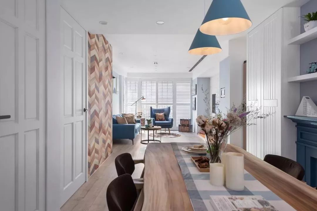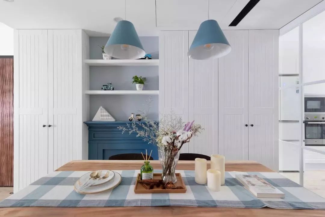 餐厅很明亮,天蓝色的两盏灯为餐桌进行补充照明,暖黄色的灯光对视力的保护比较好,颜色更加温暖,营造更加浪漫的氛围。